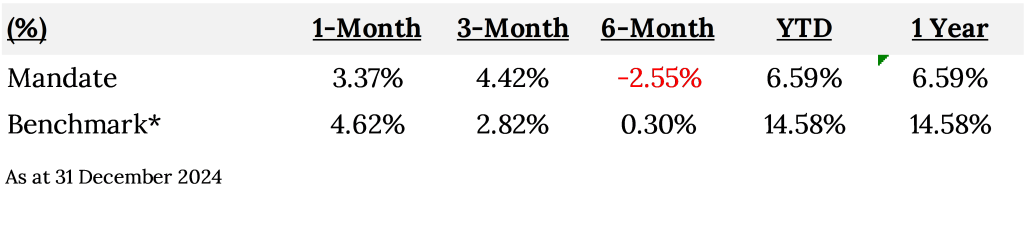 The mandate seeks to achieve an optimum return through its active portfolio management with quarterly income distribution. The investment comprised of Shariah Compliant and ethical screened stocks, focusing on fast growing sectors of the future.